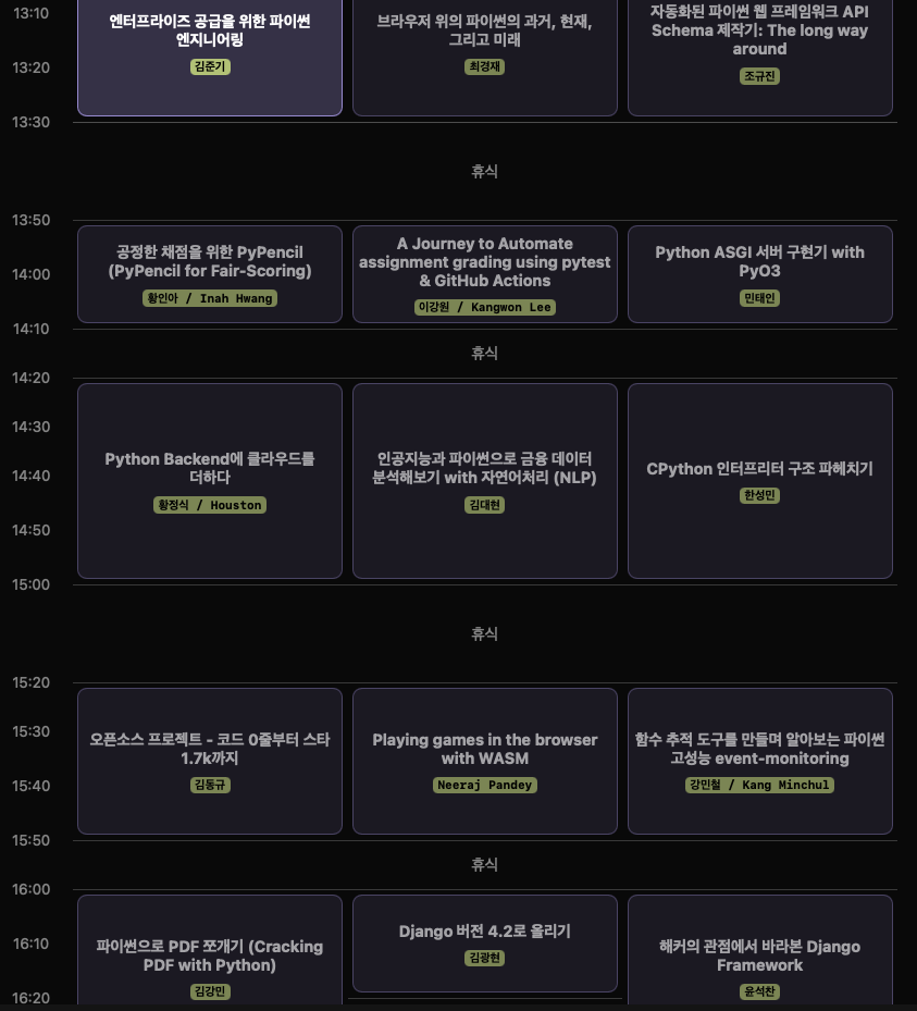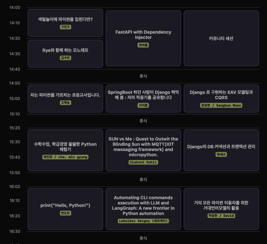 파이썬을 이용한 여러 기술들을 외국기업 재직자, 대기업 재직자, 고등학생 등 다양한 연사들이 발표해주셨습니다.