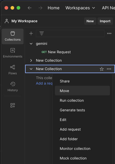 Collections -> "+" 버튼으로 New Collection 생성 -> 우클릭 -> Add request 클릭