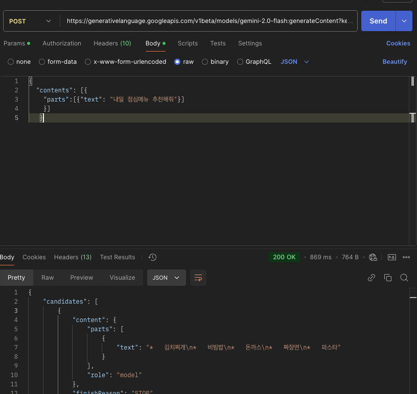 raw(json) 클릭 -> 공식문서의 json 붙여넣기 -> send → 답변 출력됨