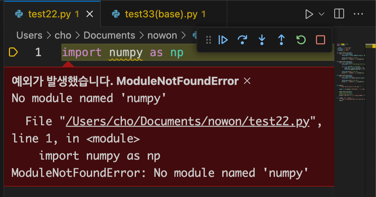 코드를 실행시키니 "ModuleNotFoundError" 가 떴습니다.