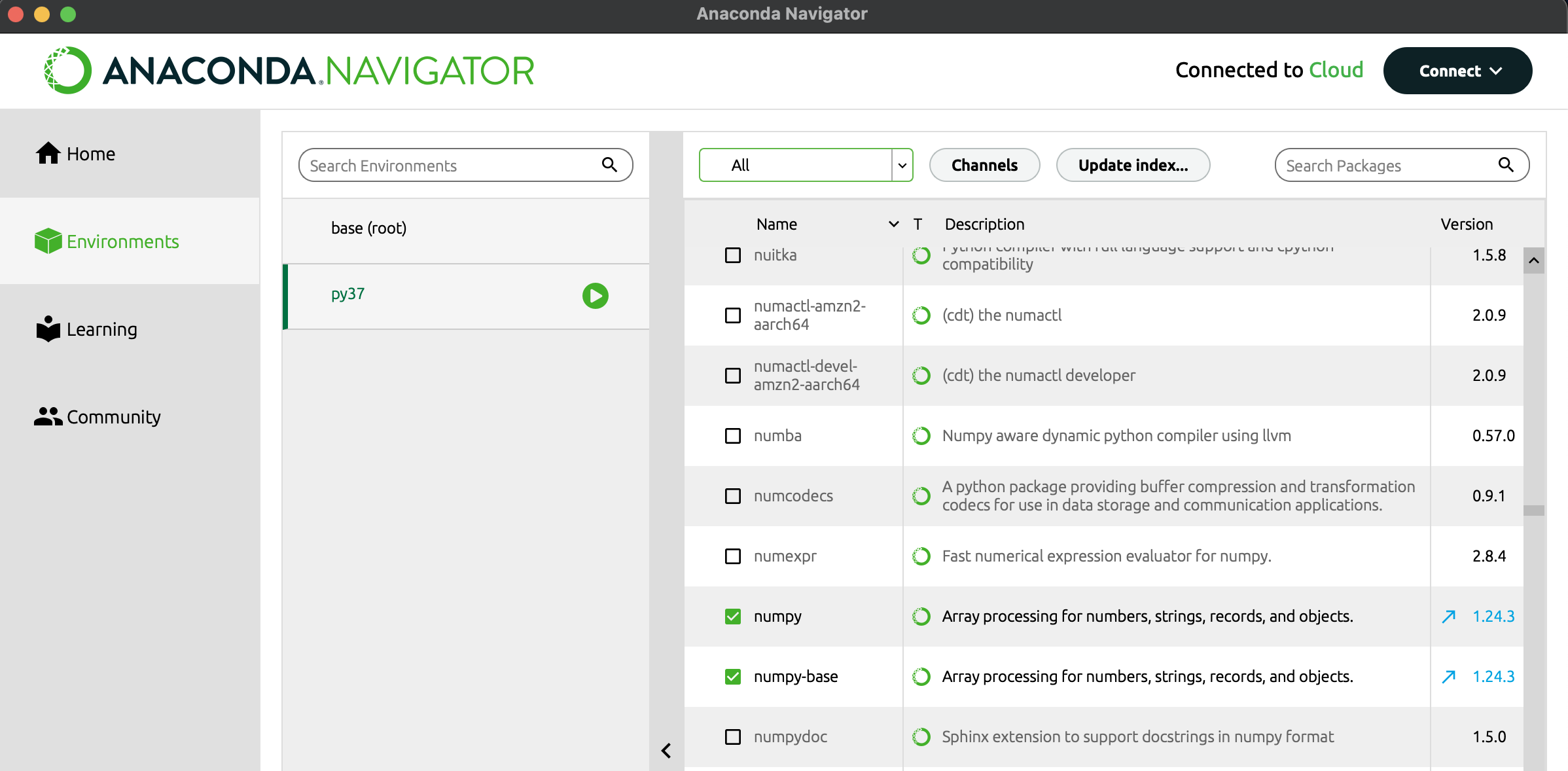 2) Environments 들어가서 패키지를 설치할 가상환경 선택하기 (전 py37을 선택했습니다.)