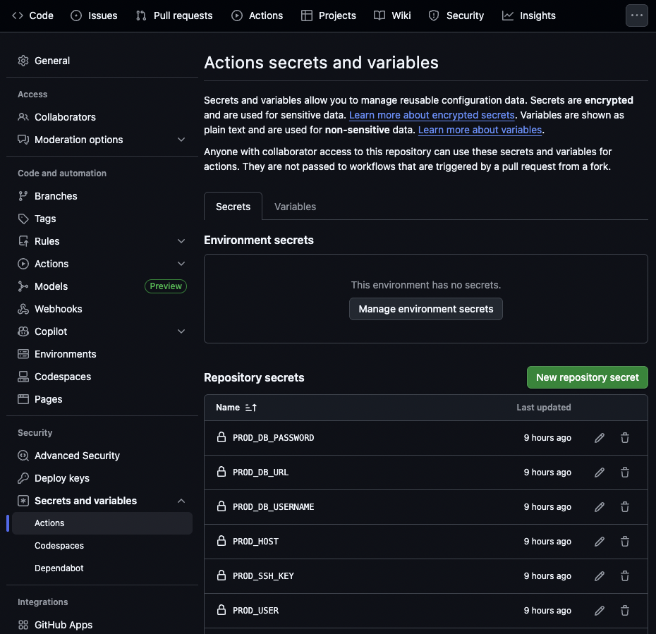 - GitHub 레포지토리 -> Settings -> Security -> Secrets and variables -> Actions