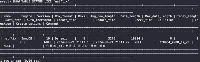 SHOW TABLE STATUS LIKE '테이블명';