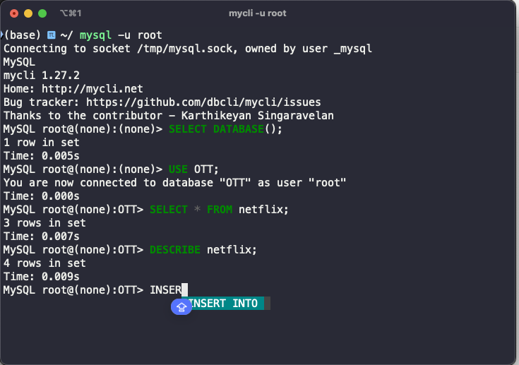 터미널에서 mysql -u root를 명령하면, 설정한 alias를 통해 mycli -u root로 접속된다.